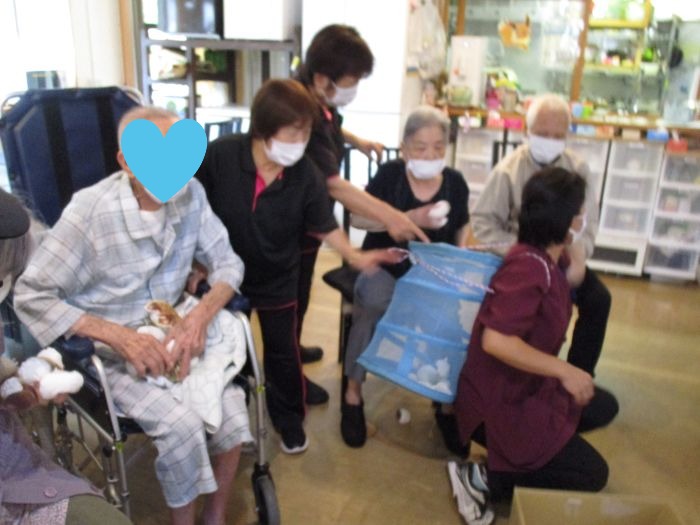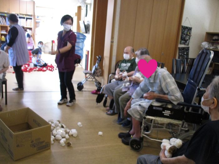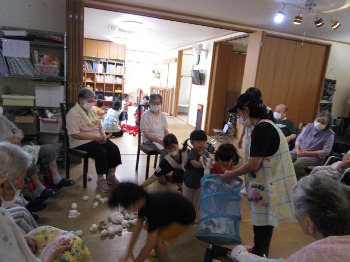 10月15日に誕生会をしました。残念ながら誕生者はいませんでしたが合同朝の会や遊戯、レクリエーションを保育園の子どもたちと利用者さんたちと一緒に楽しみました。歌を歌う時には子どもたちが利用者さんの前まで来て歌ったり、踊ったりする姿を教えていましたよ(#^^#)レクリエーションの玉入れでは子どもたちと利用者さんで対決をしました。最初は利用者さんが勝って、2回戦目は子どもたちが勝って、引き分けでした。お片づけも子どもたちが率先して入れてくれましたよ。