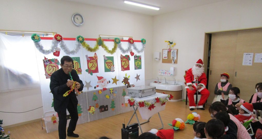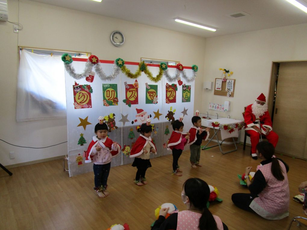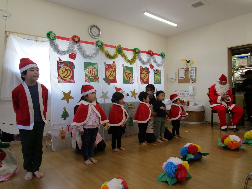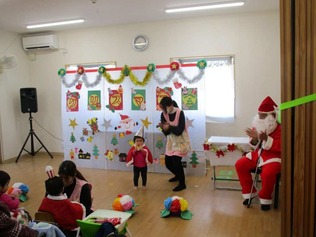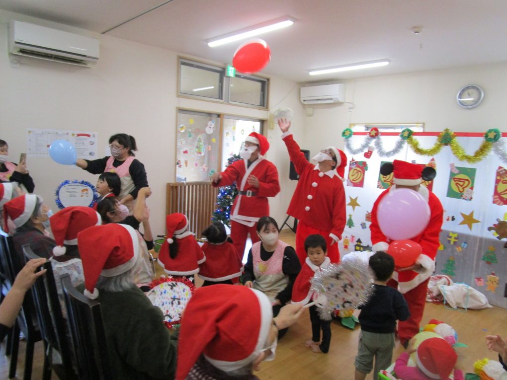 サンタさん達がたくさんやってきて、園児や入居者様方にプレゼントを配っていってくれました。
